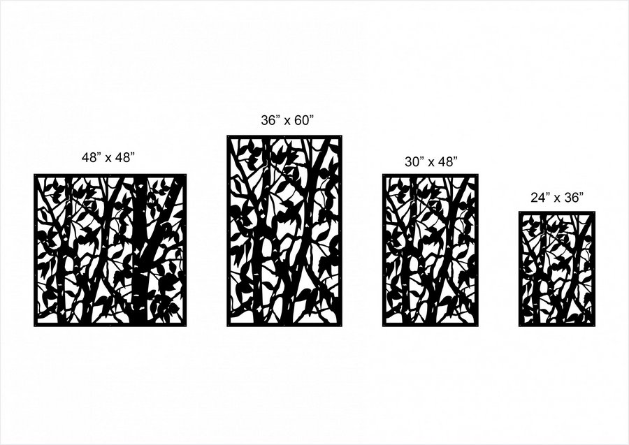 Birch Garden Privacy Panels could be used as privacy panels, gate inserts, wall inserts, decor inserts, fence inserts, wall art, etc. Panels are made from ⅛” (~3.2mm, ~0.125″) thick aluminum to last long (no rusting/ rust bleeding). In addition, the aluminum panel is powder coated for extra protection. We offer a variety of colours to choose from.