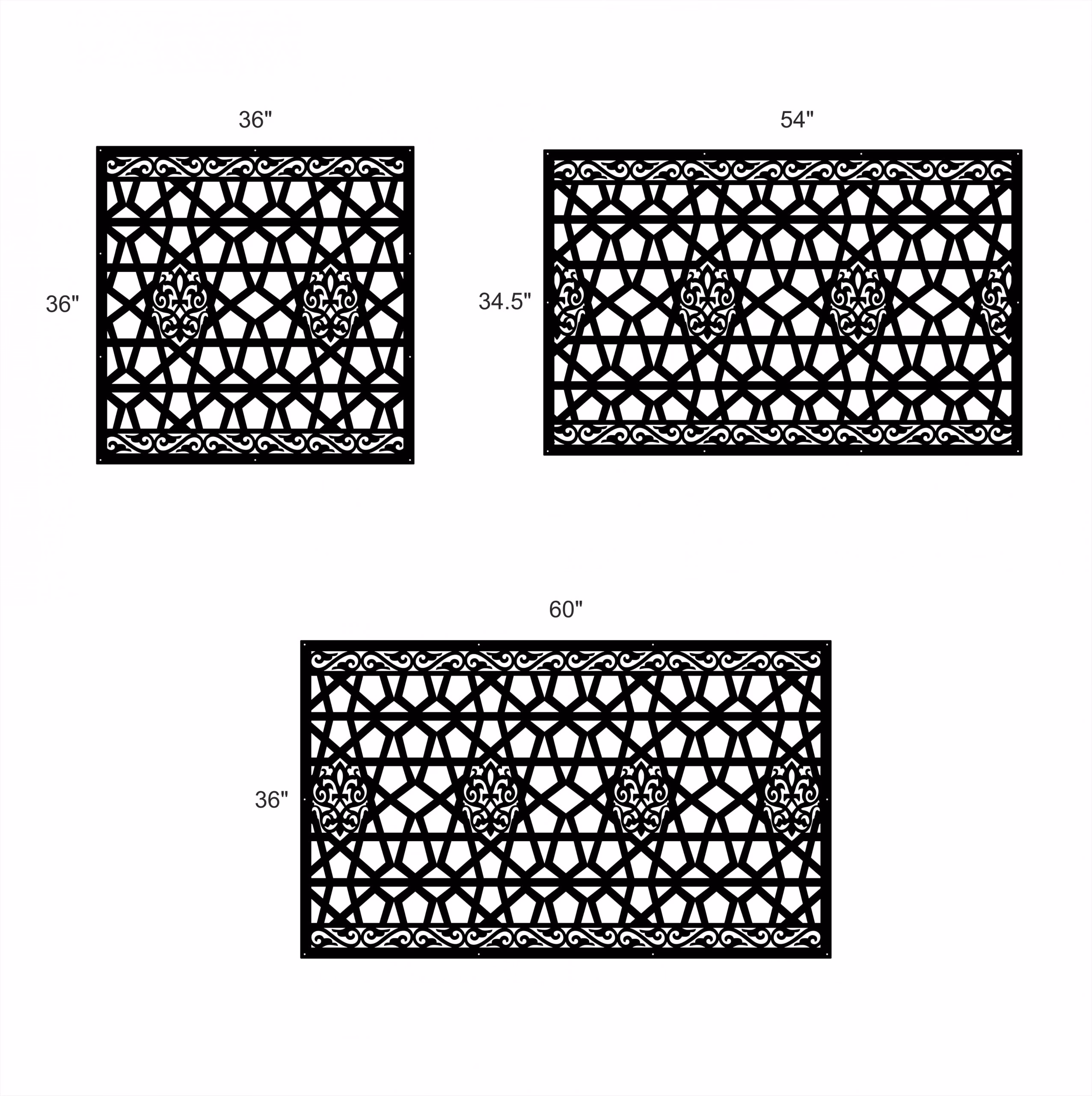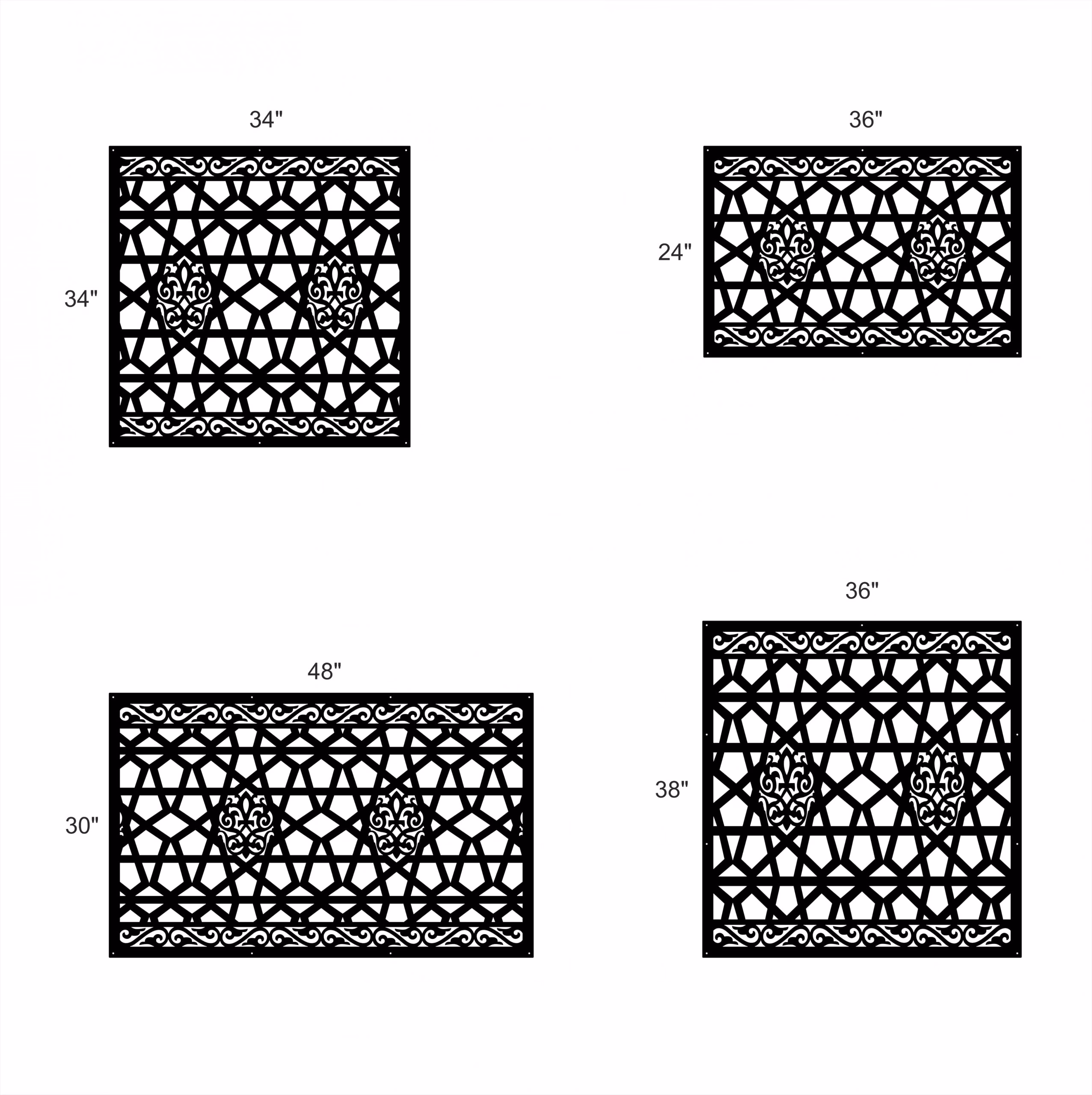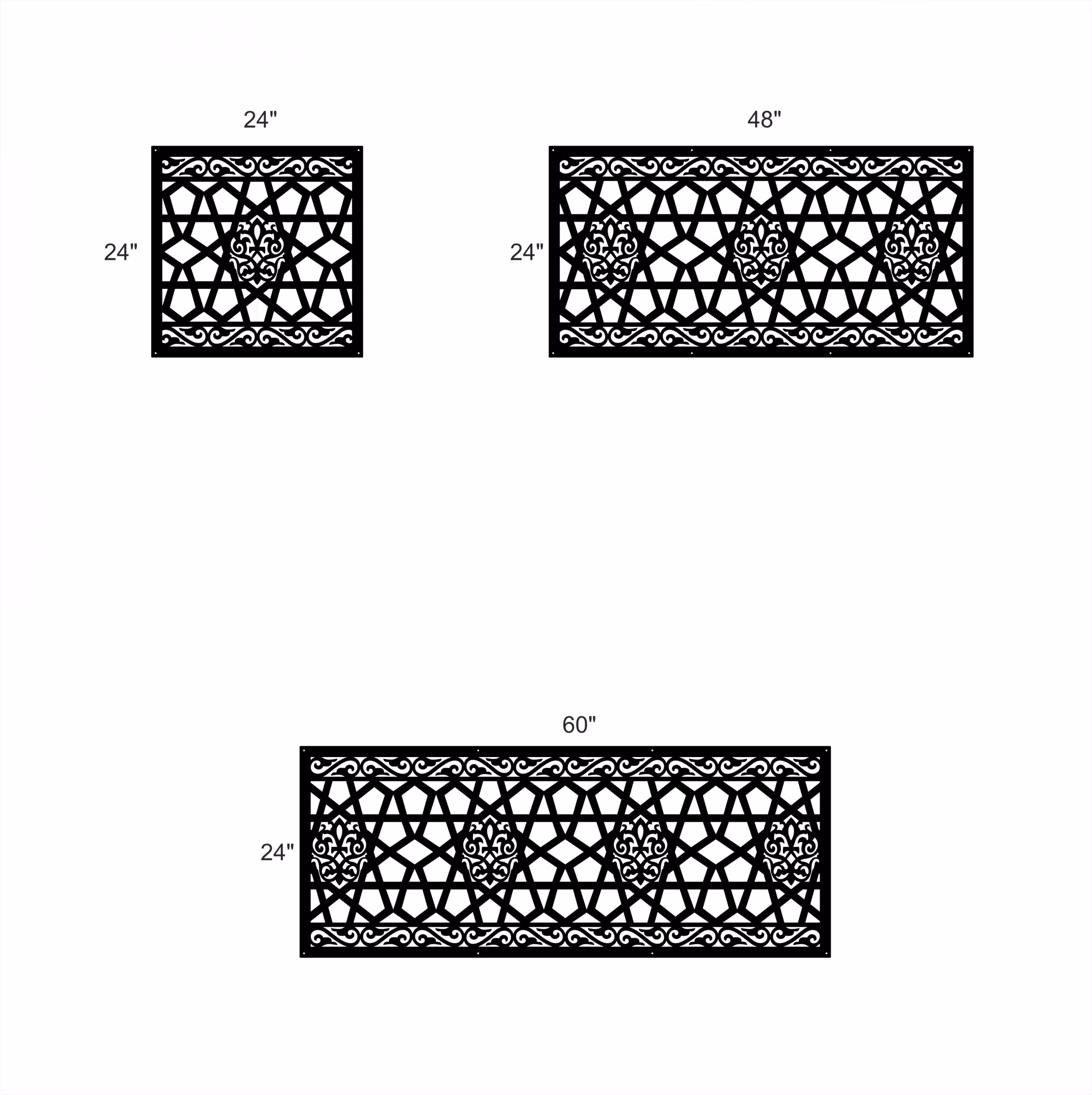 Classical Privacy Panels could be used as privacy panels, gate inserts, wall inserts, decor inserts, fence inserts, wall art, etc. Panels are made from ⅛” (~3.2mm, ~0.125″) thick aluminum to last long (no rusting/ rust bleeding). In addition, the aluminum panel is powder coated for extra protection. We offer a variety of colours to choose from.