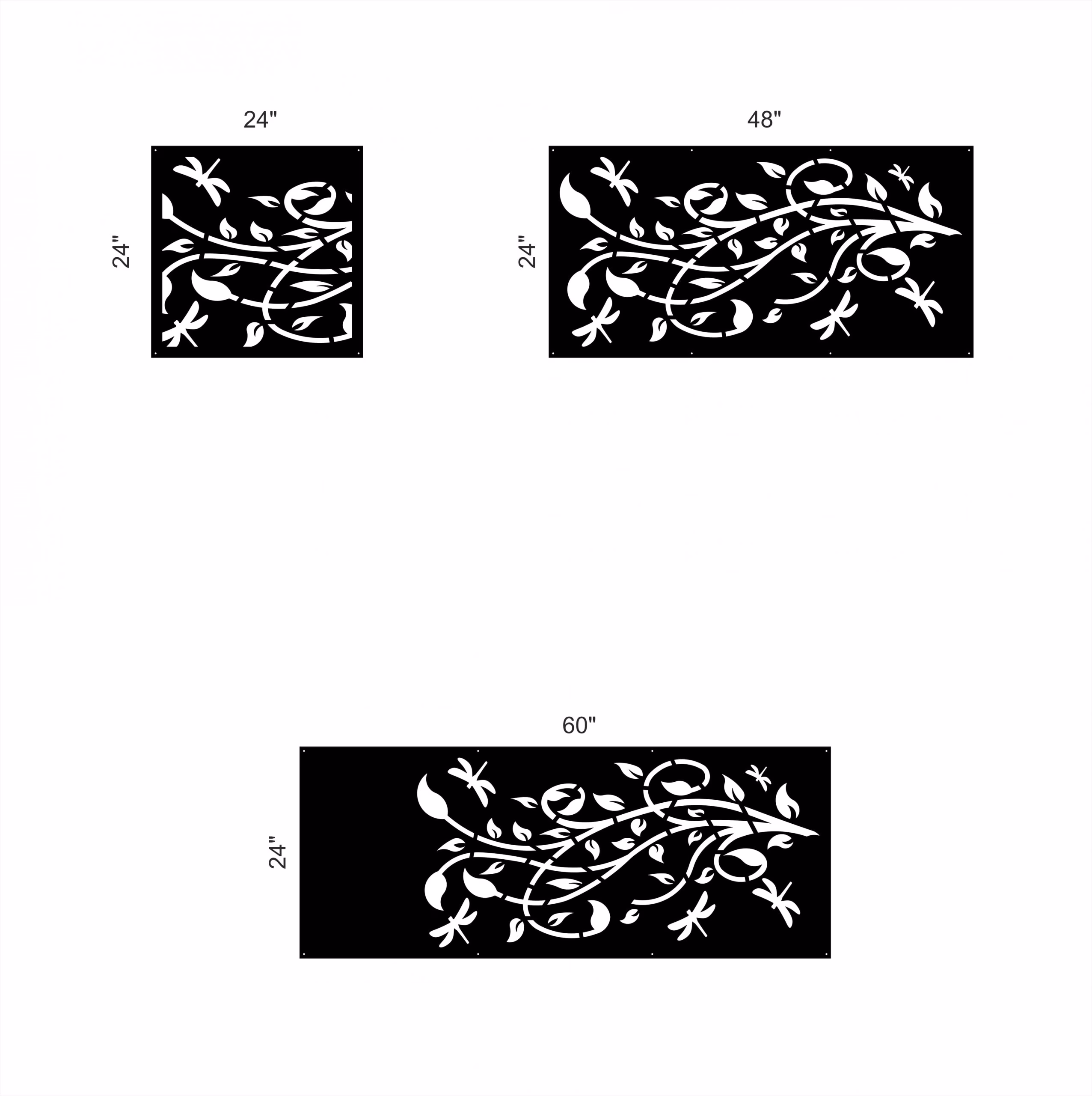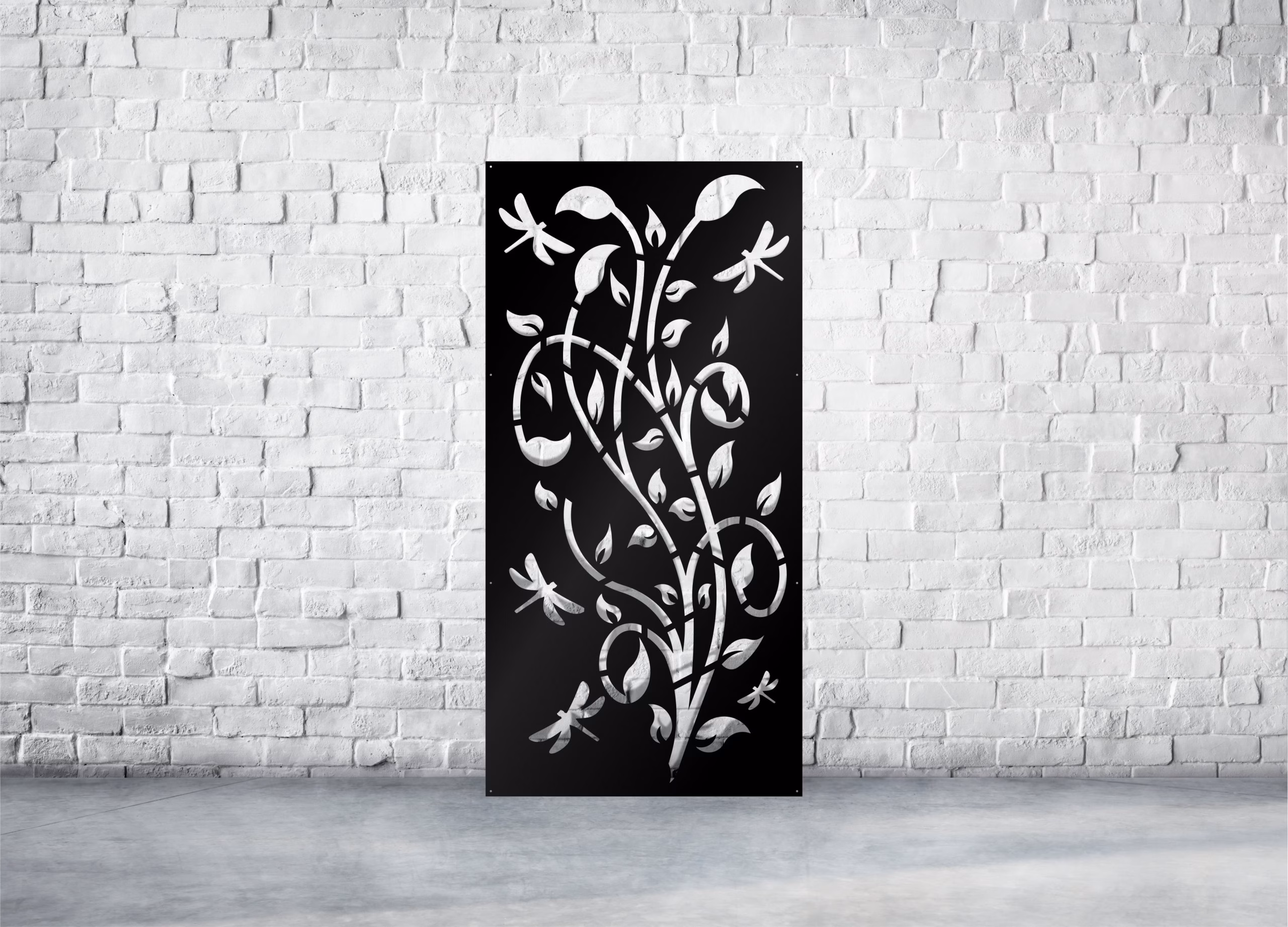 Dragonfly Privacy Panels could be used as privacy panels, gate inserts, wall inserts, decor inserts, fence inserts, wall art, etc. Panels are made from ⅛” (~3.2mm, ~0.125″) thick aluminum to last long (no rusting/ rust bleeding). In addition, the aluminum panel is powder coated for extra protection. We offer a variety of colours to choose from.