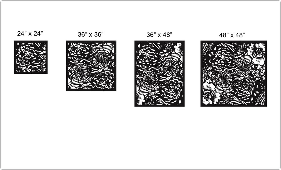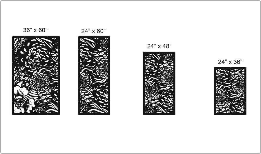 Flower Bouquet Privacy Panels could be used as privacy panels, gate inserts, wall inserts, decor inserts, fence inserts, wall art, etc. Panels are made from ⅛” (~3.2mm, ~0.125″) thick aluminum to last long (no rusting/ rust bleeding). In addition, the aluminum panel is powder coated for extra protection. We offer a variety of colours to choose from.