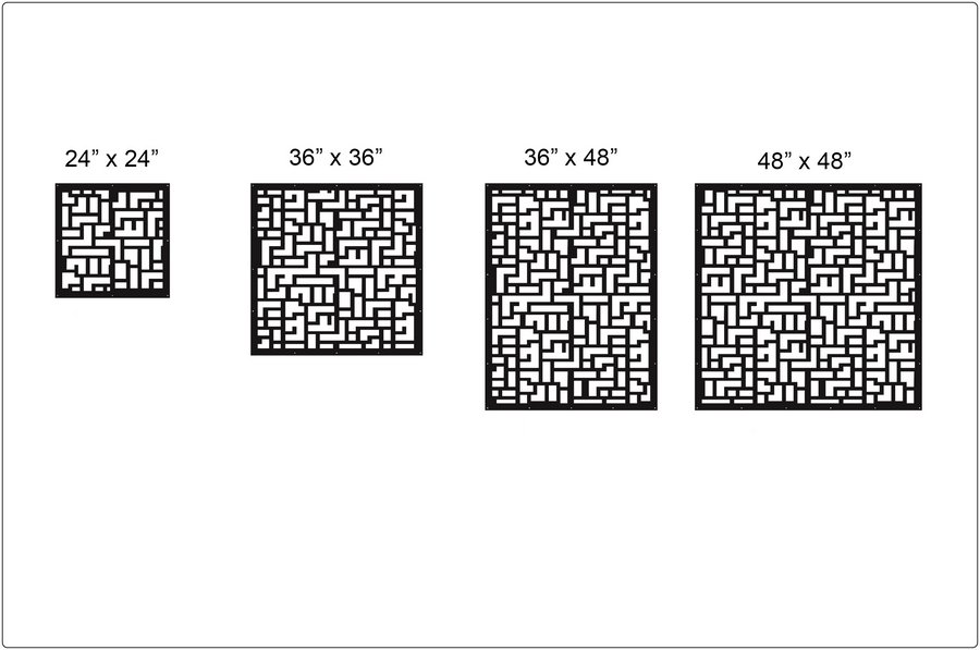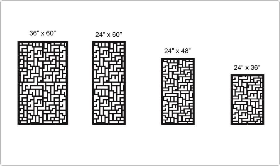 Geometric Pattern Privacy Panels could be used as privacy panels, gate inserts, wall inserts, decor inserts, fence inserts, wall art, etc. Panels are made from ⅛” (~3.2mm, ~0.125″) thick aluminum to last long (no rusting/ rust bleeding). In addition, the aluminum panel is powder coated for extra protection. We offer a variety of colours to choose from.