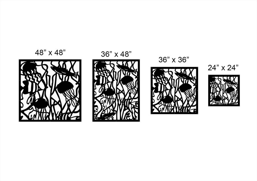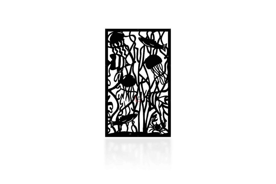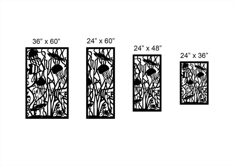 Ocean Life Panel Style 2 Privacy Panels could be used as privacy panels, gate inserts, wall inserts, decor inserts, fence inserts, wall art, etc. Panels are made from ⅛” (~3.2mm, ~0.125″) thick aluminum to last long (no rusting/ rust bleeding). In addition, the aluminum panel is powder coated for extra protection. We offer a variety of colours to choose from.