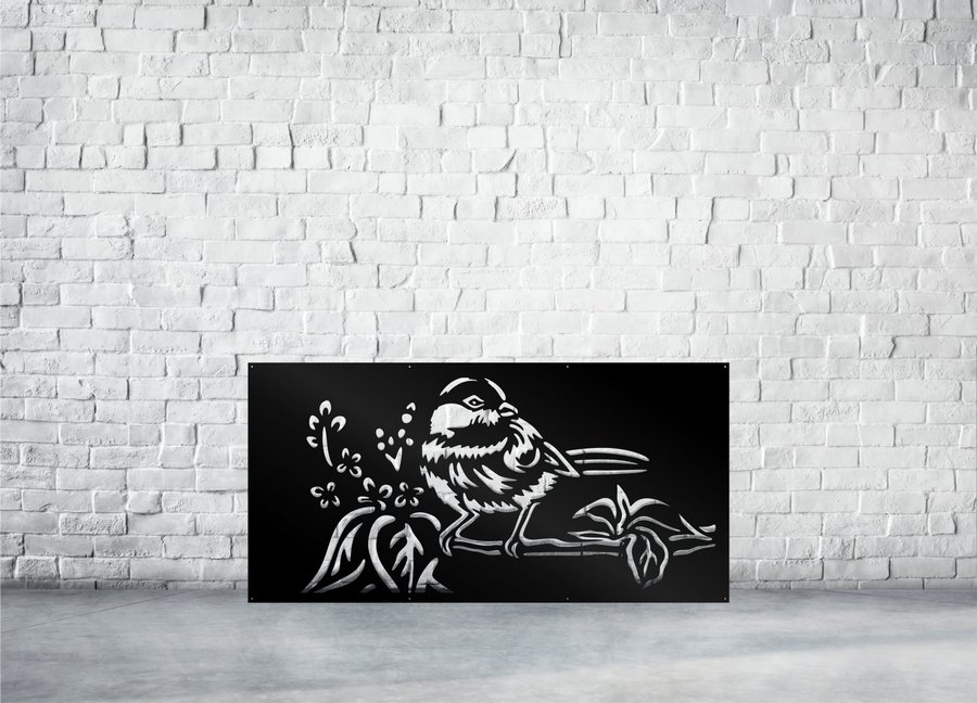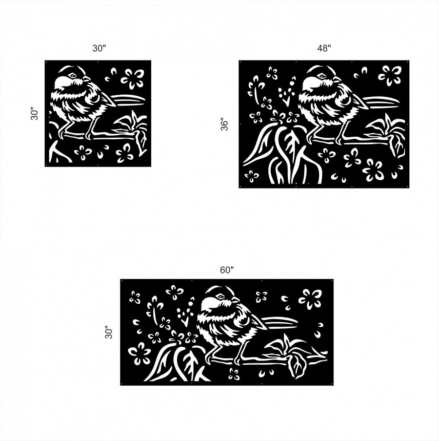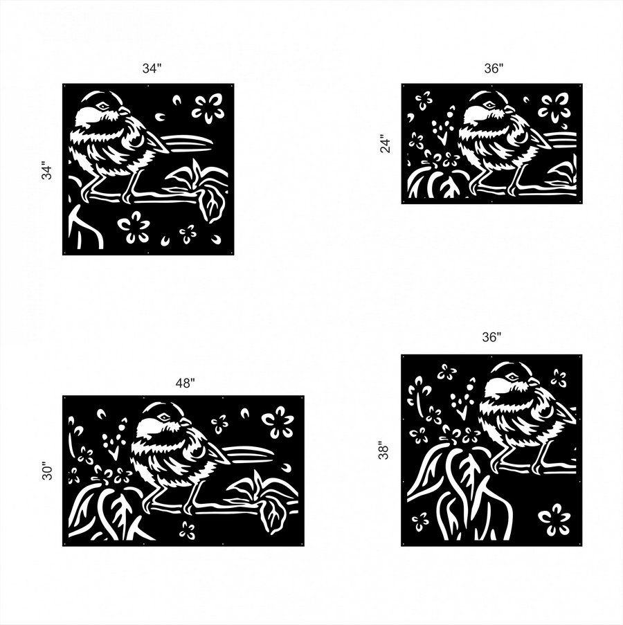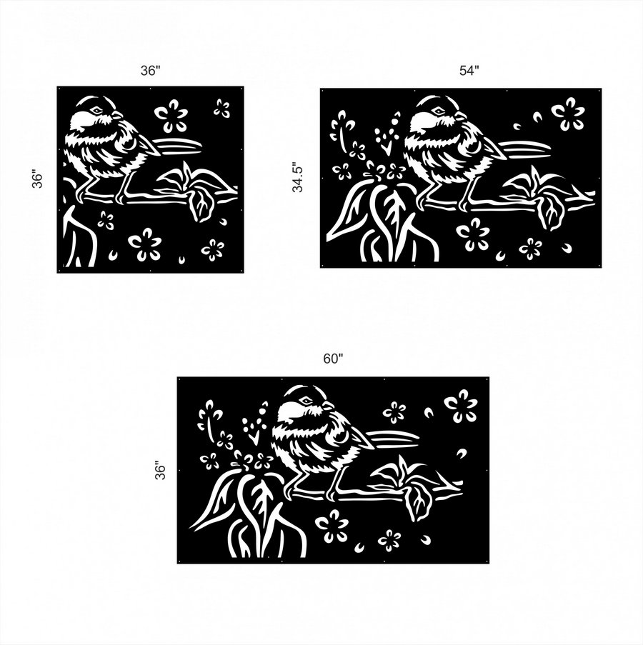 Robin Privacy Panels could be used as privacy panels, gate inserts, wall inserts, decor inserts, fence inserts, wall art, etc. Panels are made from ⅛” (~3.2mm, ~0.125″) thick aluminum to last long (no rusting/ rust bleeding). In addition, the aluminum panel is powder coated for extra protection. We offer a variety of colours to choose from.