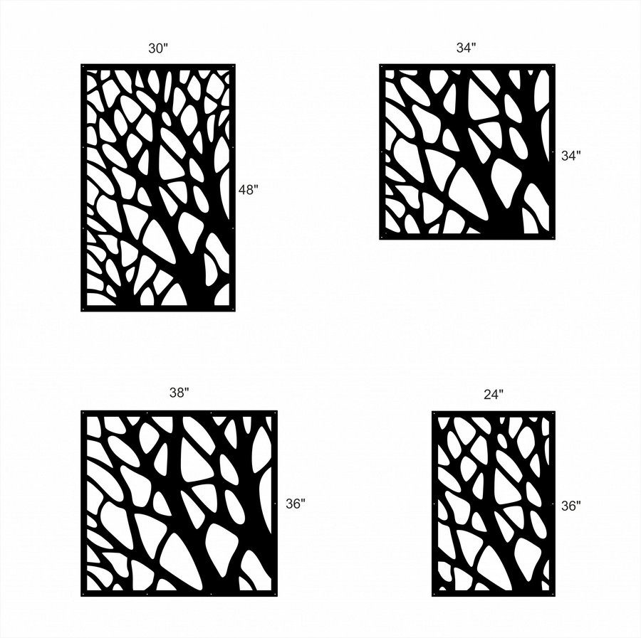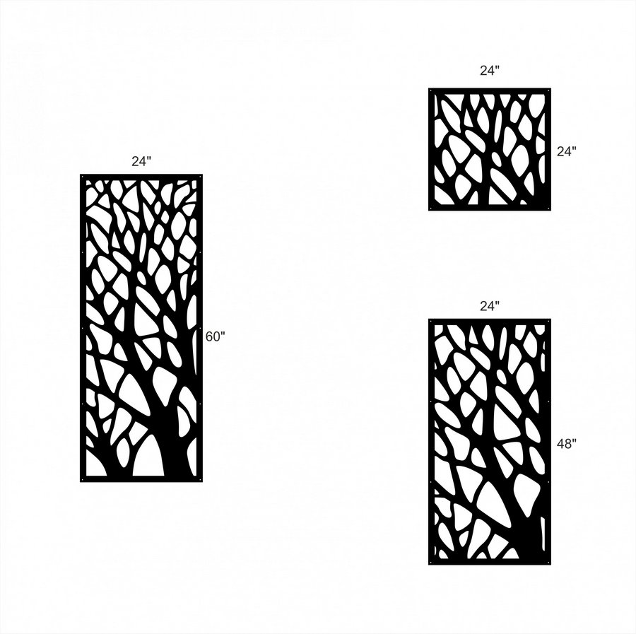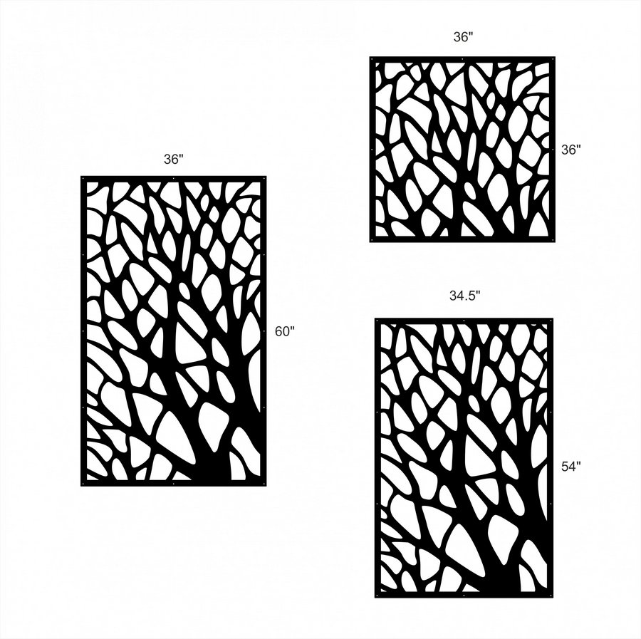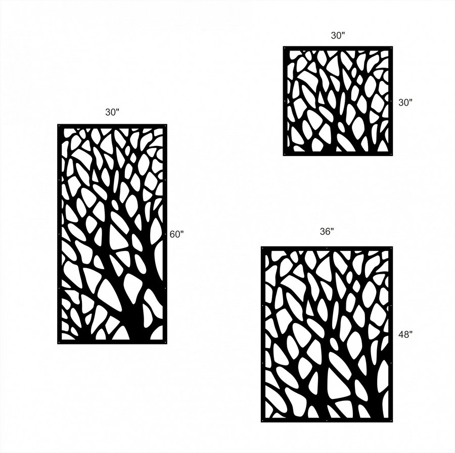 Tree Style 3 Privacy Panels could be used as privacy panels, gate inserts, wall inserts, decor inserts, fence inserts, wall art, etc. Panels are made from ⅛” (~3.2mm, ~0.125″) thick aluminum to last long (no rusting/ rust bleeding). In addition, the aluminum panel is powder coated for extra protection. We offer a variety of colours to choose from.